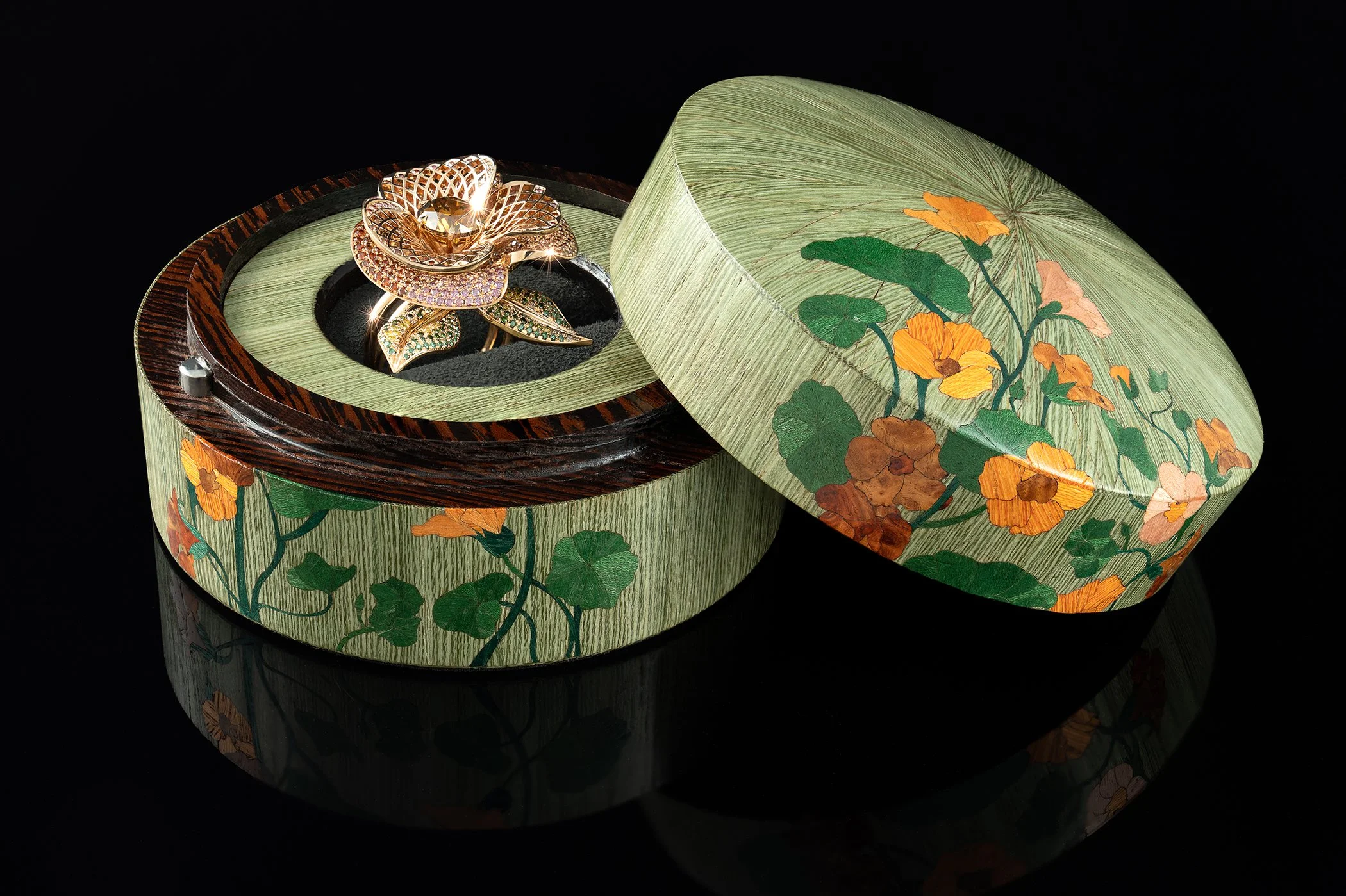 Every work of art deserves to be housed in a very special jewellery box. After taking the time to design and create each masterpiece, Nigel O’Reilly custom-designs each box with the finest artisan box-makers and veneerists in Ireland, to match the inspiration behind your jewellery commission.